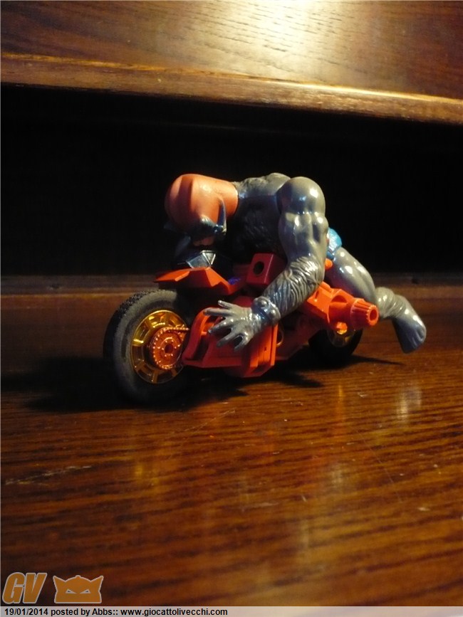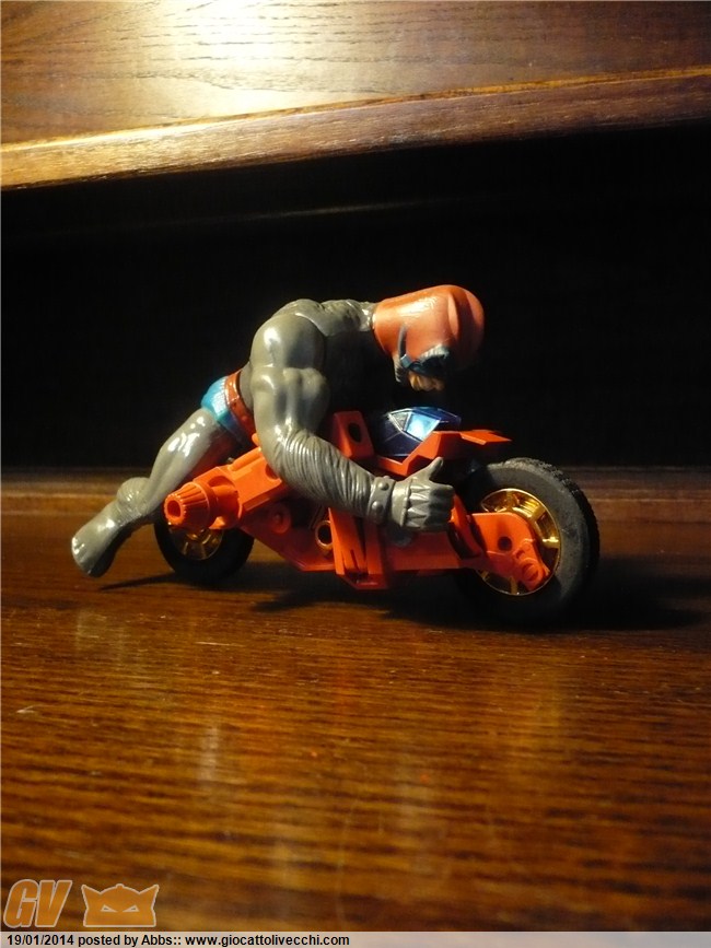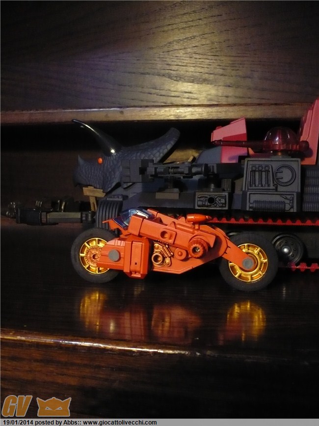 ciao garga piacere di conoscerti e ti ringrazio tantissimo per i bellissimi complimenti!!! !!! per quanto riguarda il discorso di rivivere le avventure di un tempo passato, ricordo che quando ero piccolo la cosa che mi piaceva di più, e che aspettavo con ansia, era vedere sul topolino i nuovi personaggi e mezzi che uscivano uno dopo l`altro come un torrente in piena. con questi custom nel mio piccolo cerco di riproporre quella formula. cioè creare sempre qualcosa di nuovo e differente dai precedenti. come dico spesso, comunque tutto è spinto dalla passione per questa serie e soprattutto dal divertimento nel creare ogni volta mezzi o personaggi con cui mi sarebbe piaciuto giocare quando ero piccolo. mi diverto molto a creare veicoli trasformabili come questi e la scintilla è scoppiata qualche anno fa quando rividi per caso il primo cartone sui Masters. non li toccavo più dall`epoca ma dopo aver rivisto quel cartone, ( che comunque non mi fa impazzire ) il mondo di Eteria si è impadronito di me e mi è ritornata la passione. non avevo ancora il computer però, e quindi non sapevo dove trovare i personaggi, così preso da questa passione incontenibile ho deciso di crearmi da solo qualcosa che potesse racchiudere lo spirito Eterniano del cartone: è nato così il mio primo veicolo custom che ho chiamato " La Stone Bike " un`immagine qui sotto. da lì, poi, grazie al computer ho cominciato la collezione concentrandomi al pari e forse più anche sui bootleg, e via così fino a questi ultimi custom. ti ringrazio ancora!!!!