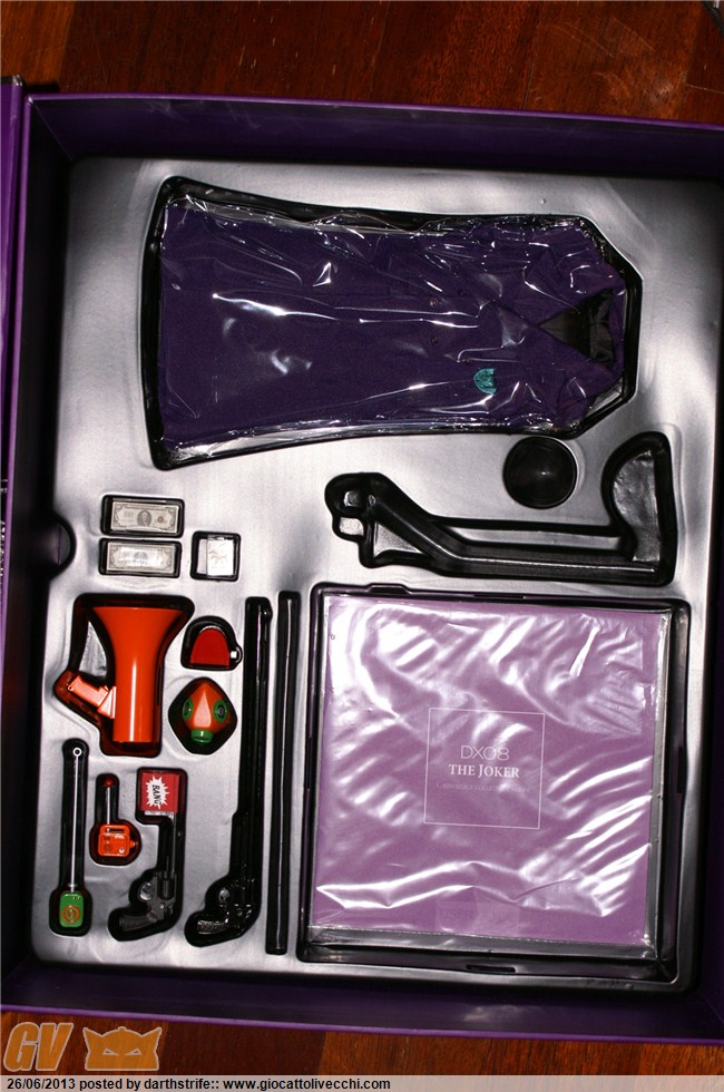 Come la solito la Sideshow farcisce di accessori i suoi prodotti e quindi potete trovare tutto il necessaire del Joker: un abbondante seti di mani, inclusa quella con la scossa mortale, bastone, carte, pistola con bandierina "BANG", dinamite, accendino, rasoio, testa intercambiabile con cappello, cappotto e nella versione esclusiva due pesci sorridenti, come nella storia Detective Comics # 475 The Laughing Fish!!