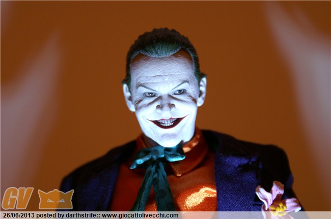Dimostrando comunque attenzione per le richieste dei collezionisti, la Hot Toys decise di lanciare nella serie MMS anche la versione del film di Burton dell’89: anche se a volte è un po’ ripetitiva, lo ha fatto anche con Iron Man, la casa di Hong Kong, quando vuole, spacca il cu..ai passeri, come si suol dire.. Questa versione di Joker è la mia preferita in assoluto, desiderata da anni, quando andai al cinema con la mia classe a vedere Batman: è proprio Jack Nicholson, il suo ghigno, le sue sopracciglia diaboliche, la sua stazza!! Il corpo è infatti leggermente imbottito per riprodurre il fisico massiccio di Jack nel film. La confezione è curata come al solito, e dalla copertina interna( come per il Batman Michael Keaton) esce un dischetto di plastica trasparente con il simbolo del Joker usato nel film: se avete una torcia abbastanza potente potete chiamare a raccolta i vostri sgherri!!! Gli accessori abbondano, pistola, megafono, cappotto, cappello, mascherina antigas, insomma è veramente una versione definitiva del Joker dell’89, e come si dice un’immagine vale più di mille parole…