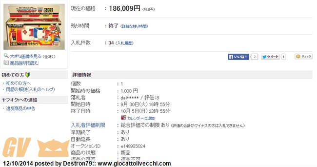 Asta del 5 ottobre 2014 Sito: Yahoo Japan Toy: Takara Transformers C-303 Minerva MISB Prezzo: 186009 Yen = 1369 Euro