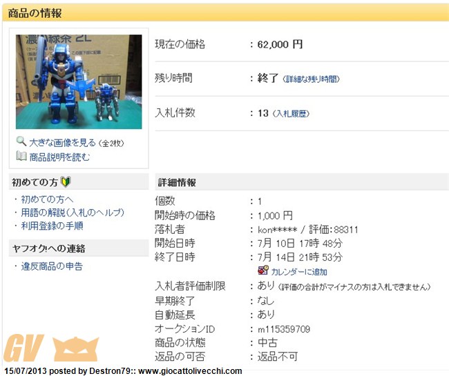 Asta del 14 luglio 2013 Sito: Yahoo Japan Toy: Takara Transformers D-310 Blue Bacchus loose completo Prezzo: 62000 Yen = 476 Euro