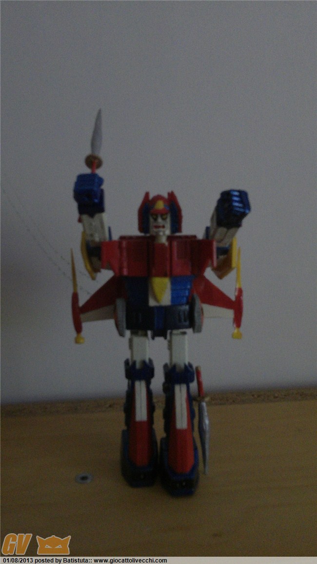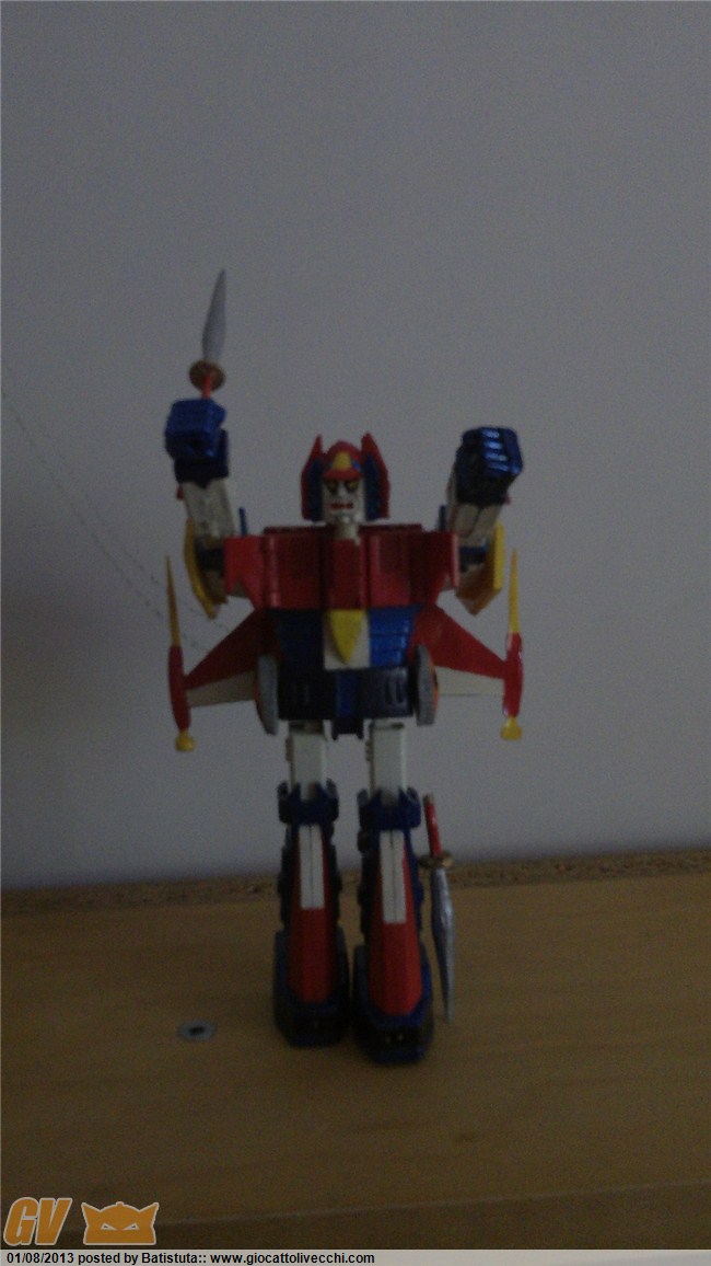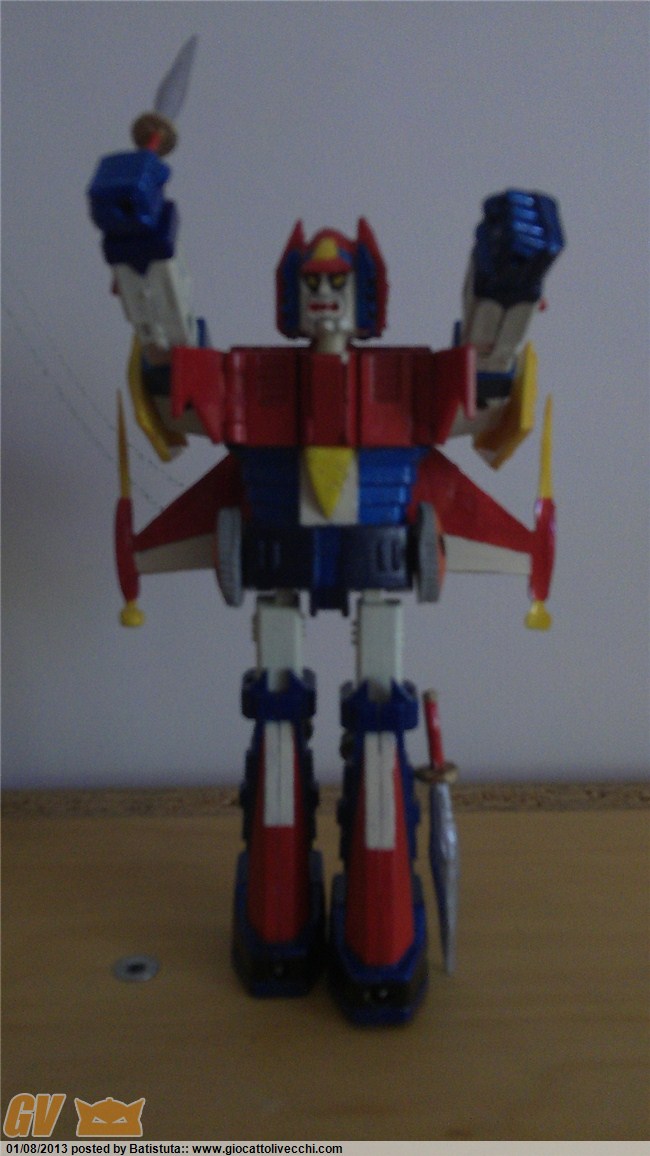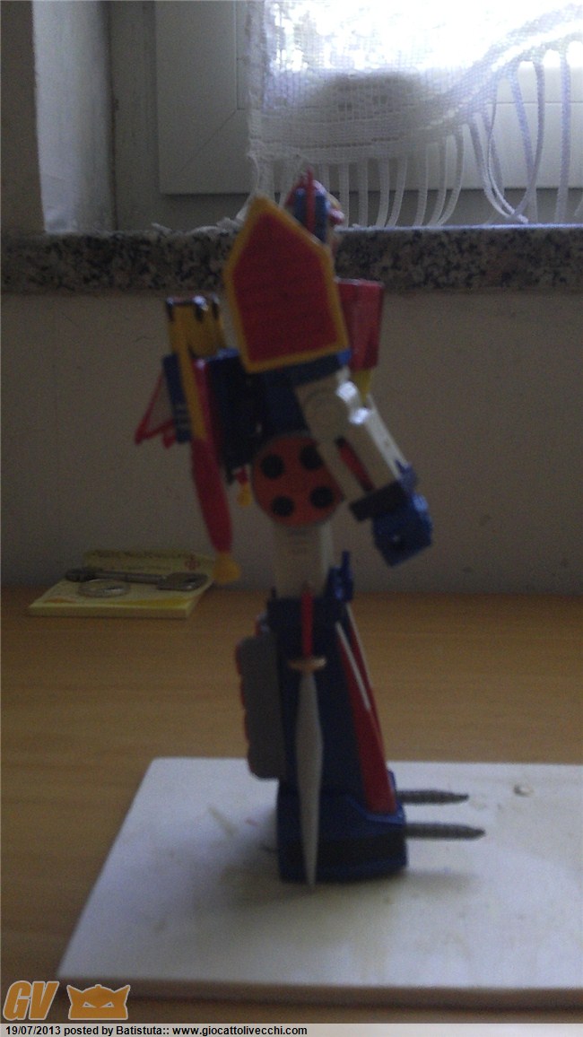 Ciao TheSender, grazie anche a te. In merito alle modifiche -che sono tante- mi sono mosso come segue. 1) La parte posteriore della testa è stata coperta con resina per coprire la vite e poi ho ridipinto tutta la testa nel rispetto dei colori dell`anime: si nota la navicella sulla nuca del robot; 2) le spade originali non mi piacevano e così le ho create ex novo sempre con resina. Sono di forma e colore simili all`anime; 3) lo "zainetto" posteriore è una repro che ho relizzato sulla base dell`originale, poi ho creato ali di legno e unendo il tutto ho creato uno stampo nel quale ho calato la solita resina; 4) i cingoli sui fianchi e quelli dietro le gambe sono anche essi delle repro che poi ho riattato e colorato. In sostanza ci sono molte parti repro, alcune costruite ex novo o riattate. Infine tutto riverniciato osservando i colori dell`anime. Ho realizzato anche una scatola di legno per metterlo dentro.