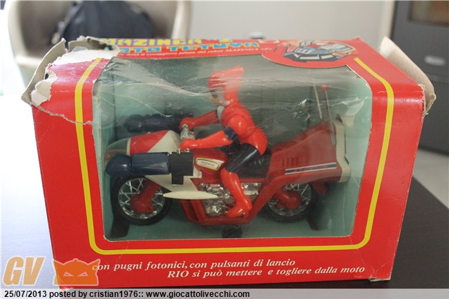salve grazie a tutti , cmq ho anche altre foto le scarico e le allego......in effetti per quanto riguarda la moto e` praticamente perfetta tranne che per i ganci dei pugni che sono rotti.Il jeeg ha un pugno che non si incastra, e la plastica di una gamba filata nel di dietro. il pulsantino della cintura e` rotto...ma siete sicuri che aveva un adesivo? xche` nella scatola parla di una cintura che diventa bracciale.....tutto il resto sembra nuovo....la scatola del jeeg non ha polistirolo dentro.Mi consigliate di fare un asta quindi? xke` a settembre e non subito?