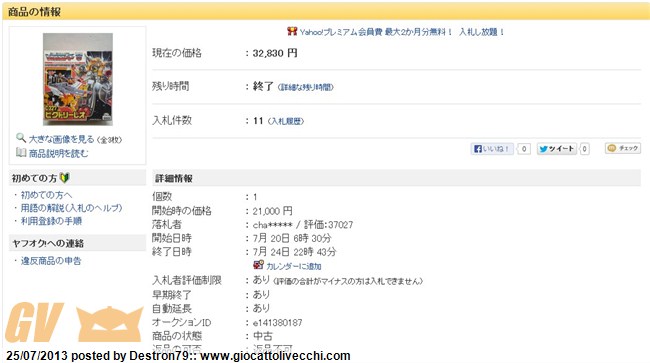 Asta del 24 luglio 2013 Sito: Yahoo Japan Toy: Takara Transformers C-327 Victory Leo MIB Prezzo: 32830 Yen = 250 Euro