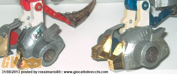 Inoltre molto probabile che, cronologicamente, il petto rosso sia uscito a cavallo tra quello petto blu e quello pre-rub g1 in scatola diaclone gig. Difatti in quest`ultimo (il terzo che prendiamo in esame) è chiara la matrice g1 visto che il tricex in sè è un pre-rub e gli accessori sono proprio quelli della g1. Le differenze coi due diaclone sono notevoli: corna rosse, testa nera, petto rosso ma il retro è nero (attenzione), gambe nere, spada rossa e lanciamissli nero.