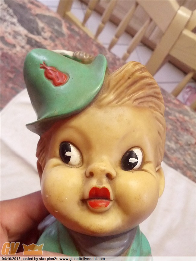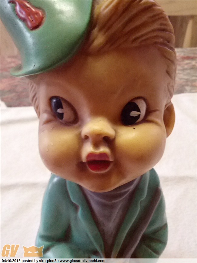 salve a tutti vorre chiedere cortesemente una valutazione di questo pupazzo in gomma tipo ledra ma secondo me piu`vecchio e dipinto a mano alto all`incirca 25 cm fischietto funzionante, la testa si puo` ruotare, da ripulire ancora a fondo ma tenuto molto bene, grazie