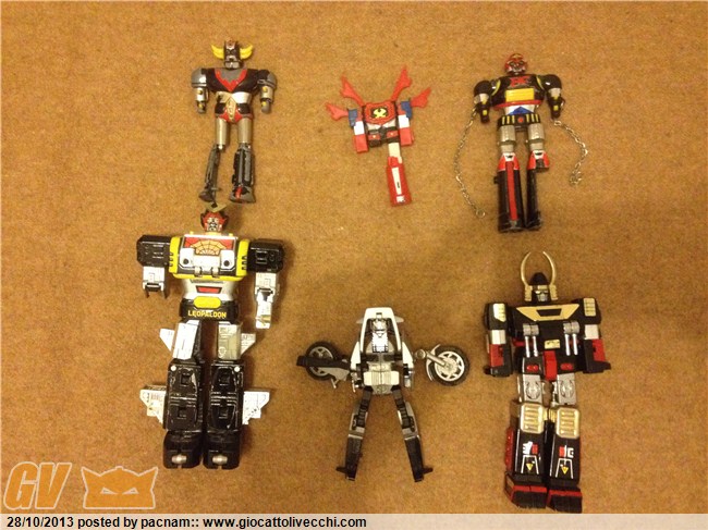 circa il riconoscimento: lepaldon e`il robot della serie live action/"sentai" di spiderman... goldrake e`un st della popy, poi c`e`un altro st... del battlefever (bf in petto). quello decapitato e`un mini goshogun / go trinitron, presumo ceppi ratti. l`astronave e`della serie starzinger, in particolare e`quella di jan coog. la moto stavo per dire wingman winner II, sempre popy, ma la ricordo diversa... che marchi reca?