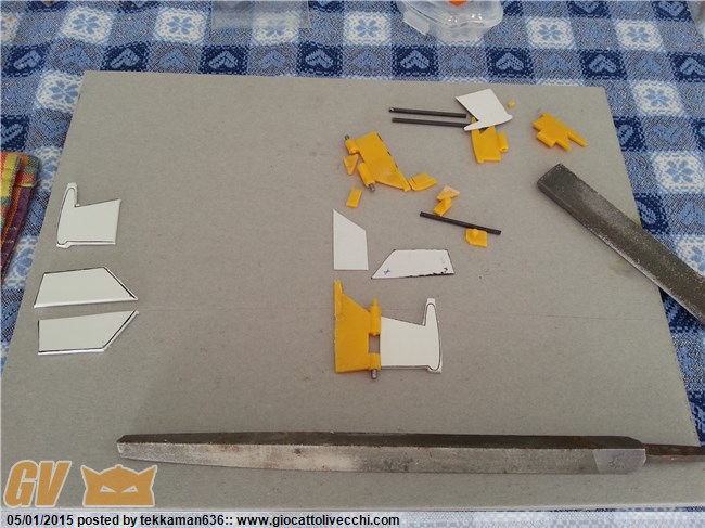 Poi sono passato a fare delle prove realizzando dei particolari con un pezzo di plastica piatto, dal quale ho ricavato le due estremità più allungate delle originali, dato che ora li verso per il quale sono riposte, permette di aumentarne la lunghezza, conferendo al modellino un aspetto più grintoso.