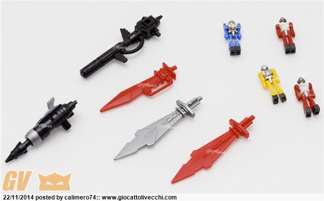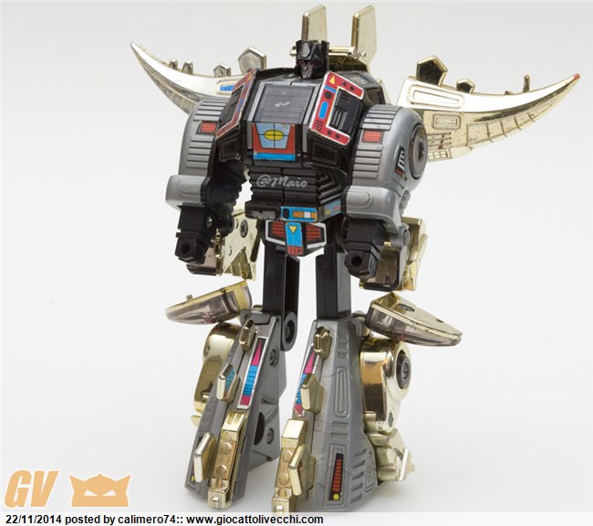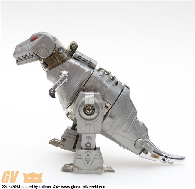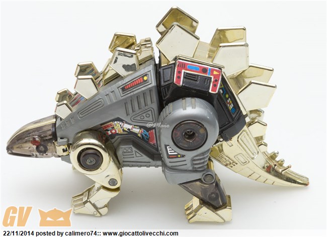 -tirannosauro bisogna verificare che sia originale perchè ad occhio come dicevi tu le plastiche dorate sono un pò troppo opache ed il bacino blu è un troppo chiaro il marchio lo trovi sul lato interno del piede destro in versione robot se originale dico max 30 se ko 15 purtroppo poi la spada rossa non è la sua ma dello pterodattilo da sola puoi provare sui 10 euro