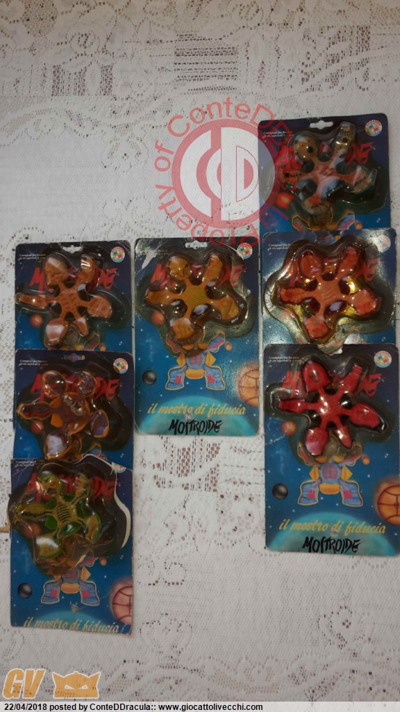 ma che belli!!!! che spettacolo! insieme agli Spuzzy sono tra i giocattoli più mostruosi degli anni 80! poi tu hai tutti gli Spuzzy! insieme ai Mostroidi viene fuori un`esposizione grandiosa! fantastica la variante verde e gialla dello Yelloide, e anche la variante rossa del Flamboide con un occhio solo è grandiosa!! forse il mio Mostroide preferito. il bello di questi mostri era anche la differenza di colori tra la modalità meteora e il mostro. guardando la palla chiusa era impossibile indovinare il colore del mostro, a meno che uno non li conoscesse già ovviamente. fantastici! hai fatto bene ad imbustarli per preservarli! con gli Spuzzy viene fuori un`esposizione mostruossima! spettacolo!!! collezione mostruosa spettacolare!!!