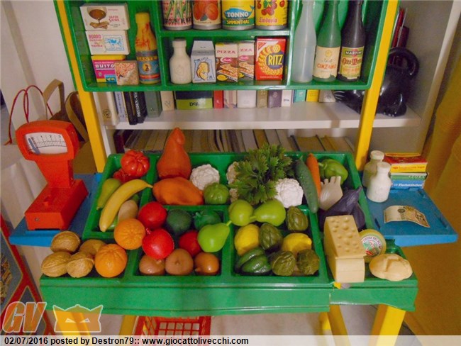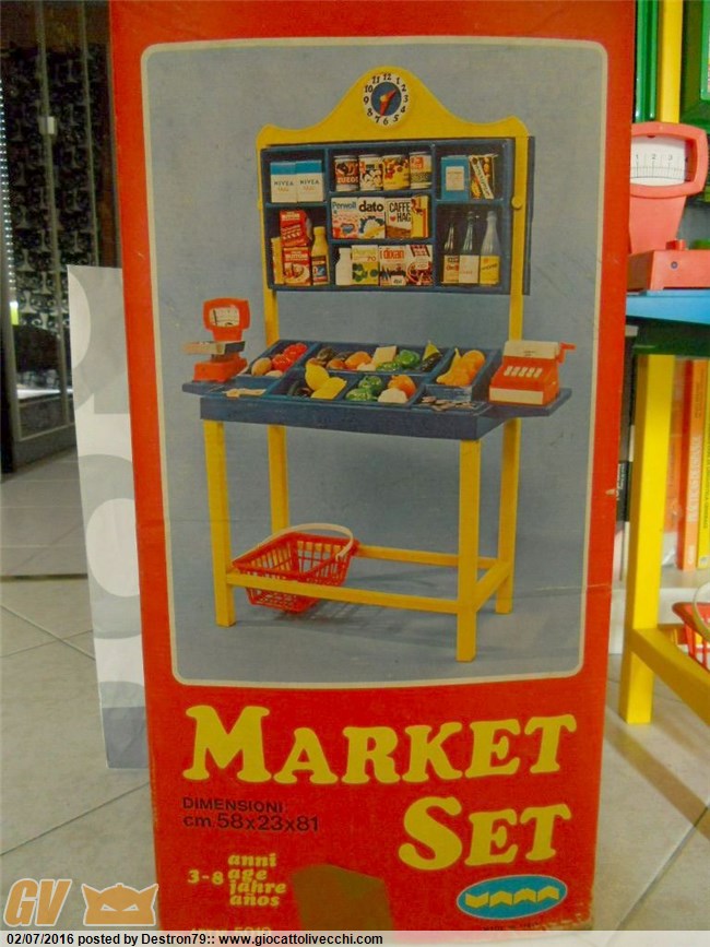 L`altra sera ero a cena dai miei ed ho fatto una capatina in cantina, dove ho ritrovato, abbandonata in un angolo, la scatola di una bancarella del mercato giocattolo che avevamo io e mio fratello quand`eravamo piccoli. Io avrò avuto 5 o 6 anni al massimo, forse meno. Con mia grandissima sorpresa, nella scatola c`era ancora quasi tutto! Ho rimontato con cura la bancarella e mi sono sinceramente commosso a guardare, dopo tanti anni, i prodotti giocattolo, fedelmente miniaturizzati e, soprattutto, con le vere marche italiane dell`epoca!