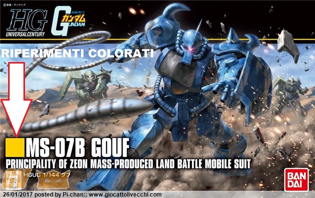 Intendo i "quadratini" colorati che si vedono assieme al nome del modello nei gunpla HG 1/144... ...ogni colore corrisponde ad una serie, il giallo scuro è la serie ORIGINALE...la prima...