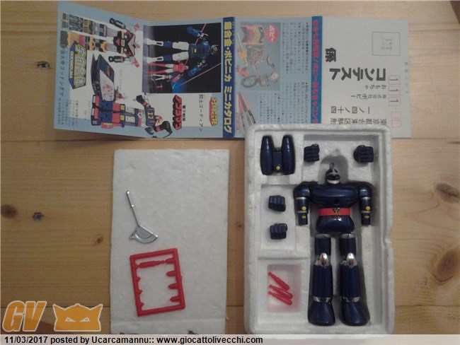 Ciao Il modello è completo. Proprio ad essere fiscali mancherebbe il cataloghino... IL GB23 MINT in Giappone ormai è difficile faccia meno di 350 Euro. Qui se ne vedono assai raramente. Viste le imperfezioni da te citate, i missili staccati dal telaio ed appunto la mancanza del cataloghino ci si potrebbe indicativamente assestare sui 250 Euro. Un saluto GS