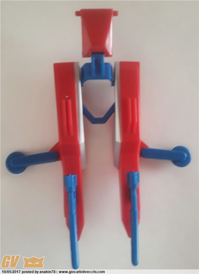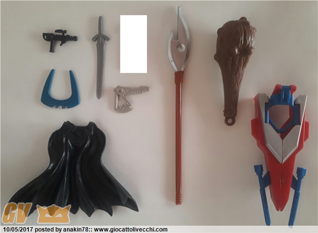 1) Pistola nera 2) Spada 3) Alabarda 4) Clava 5) Mantello nero in plastica semirigida, con perno d`attacco 6) Pistola chiara 7) Astronave trasformabile 8) Corna