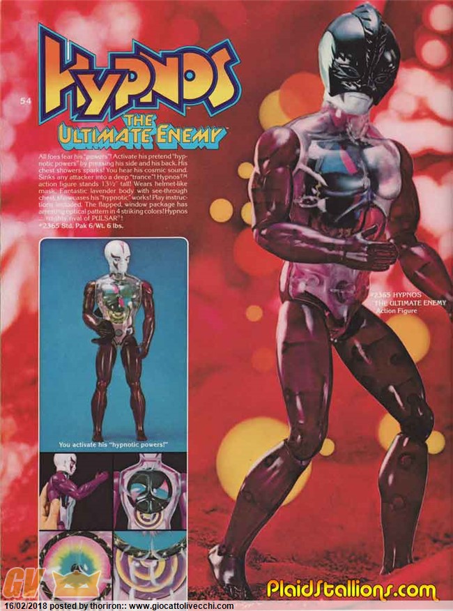 Grazie Prime...il personaggio del mio avatar si chiama hypnos e fa parte della serie Mattel Pulsar del 1977..il mio manca della maschera nera ma anche secondo me è davvero bello...ti posto le foto dei personaggi prese dalla rete