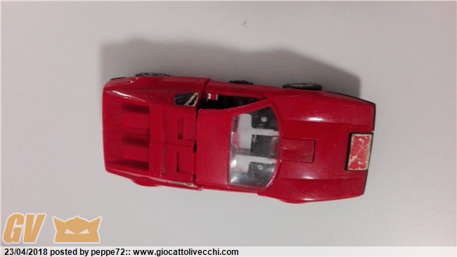 Si chiama Overdrive, il suo alt mode e` infatti una Ferrari 512 Berlinetta. Potrebbe trattarsi della versione Diaclone del modello, dal momento che vedo soltanto il logio della Takara e non quello della Hasbro. In ogni caso, il modello appare incompleto. Il suo valore si dovrebbe attestare sulle 20/25 euro.