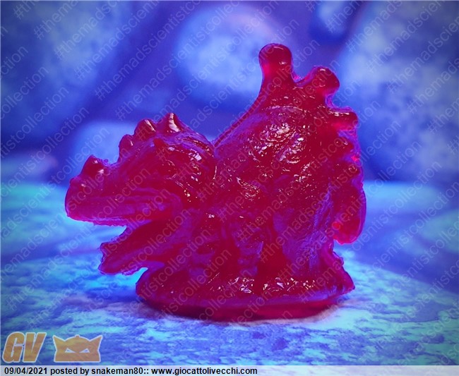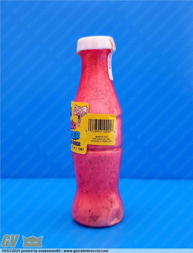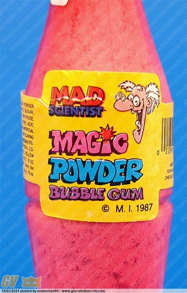 Esiste qualcosa di commestibile nella linea di giocattoli Mad Scientist? Beh, se escludiamo il bicarbonato di sodio contenuto nel `Laboratorio dei Mostri`... sì!!! Ecco la Magic Powder Bubble Gum, la gomma da masticare in polvere, prodotta in Italia e venduta in un`adorabile mini-bottiglia nei colori rosso e giallo! Si tratta di un pezzo veramente raro, da classificare nella categoria `outside` della linea. Ah, ovviamente oggi quella polverina non è più tanto commestibile, ma non per gli scienziati pazzi che non hanno potuto fare a meno di provarla! Have fun!
