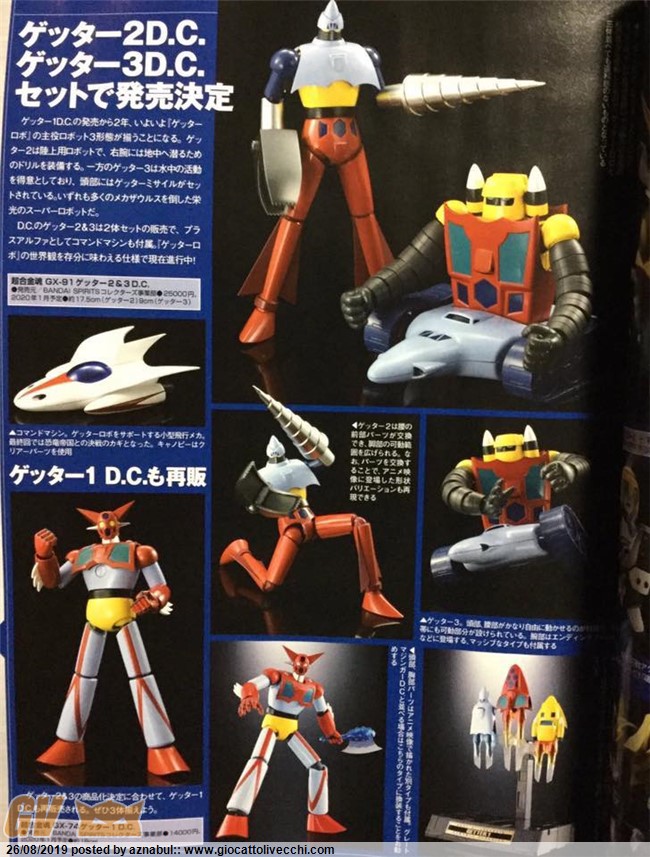 beh, il senso dell`operazione (oltre a fare soldi, visto che in asia e madrepatria questi soggetti sono idolatrati alla follia - non dimentichiamo che il getter è il primo gattai della storia robotica - e non come da noi subalterni a gentaglia tipo il great mazinger) è dare un accomapagnamento al gx 74 getter 1, oltre che a ricreare il 2 e 3 più simili alle controparti animate (con tutto il bene che gli voglio, il g1 del gx 06 a fianco del corrispettivo dynamic fa la figura del cuggino brutto...) ed a farli quasi completamente in metallo (come sono i DC) senza gommine squaglievoli e togliendo anche gimmick ridicole tipo i pugni sparanti che a quarant`anni anche no grazie ...