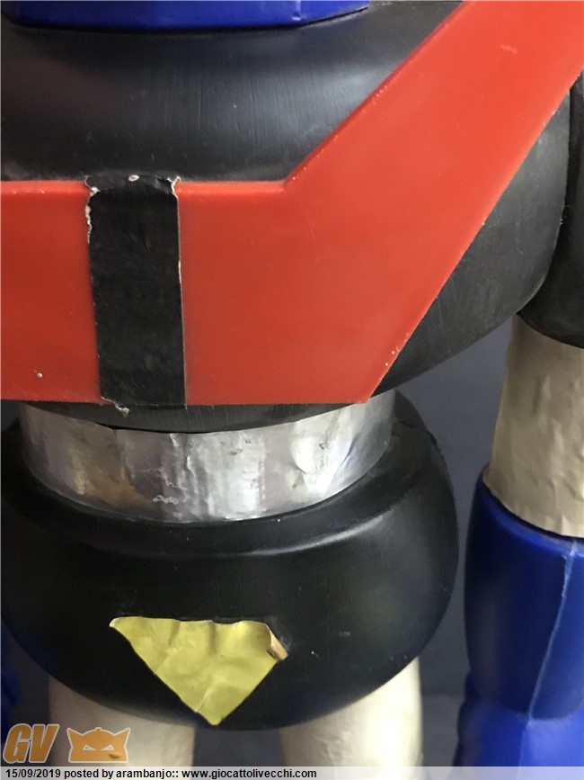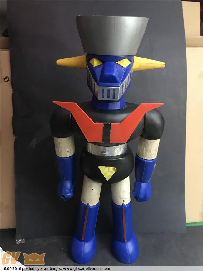 E` il taroccone made in Italy che veniva venduto sulle bancarelle. Nella testa c`erano degli anelli ed il gioco consisteva nel lanciarli cercando di centrare la testa, le braccia o la V sul petto, tipo i ciochi del Luna Park. E` comunque un Mazinga Z, quindi io direi 70/90, ma è un`opinione personale.