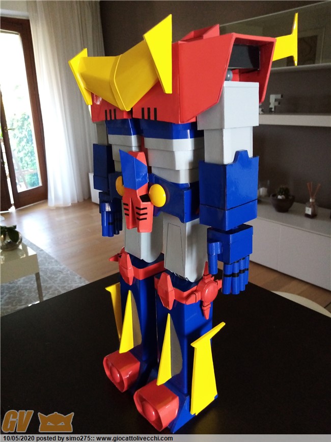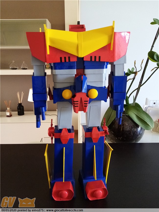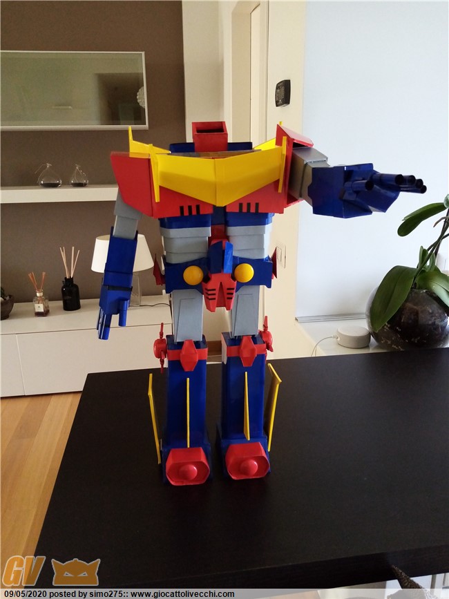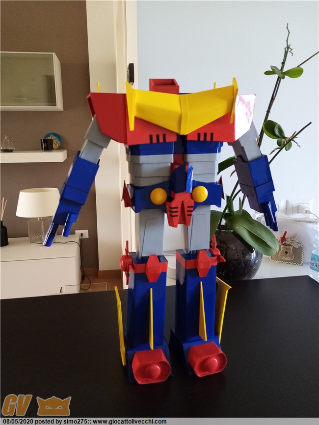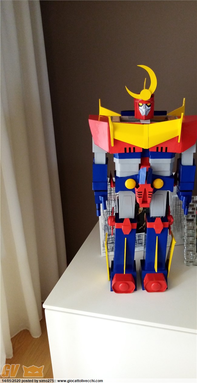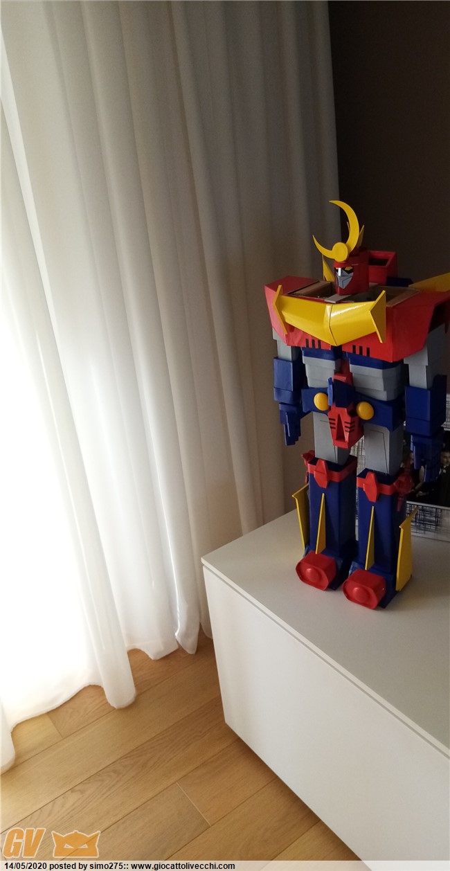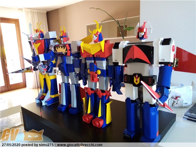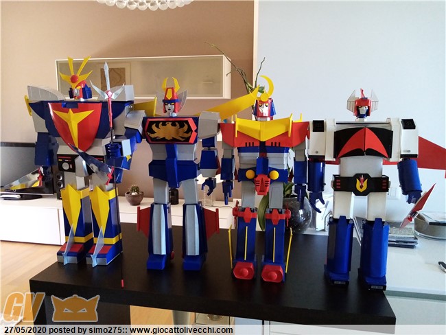 Scusate il ritardo ma essendo tornato a lavoro non ho potuto dedicarmi a terminare Zambot. Comunque ora è finito e ho fatto foto dei 4 modelli realizzati ed allineati in base all`altezza Daitarn 3 alto 72 cm Trider e Zambot 65 cm Danguard 60 cm