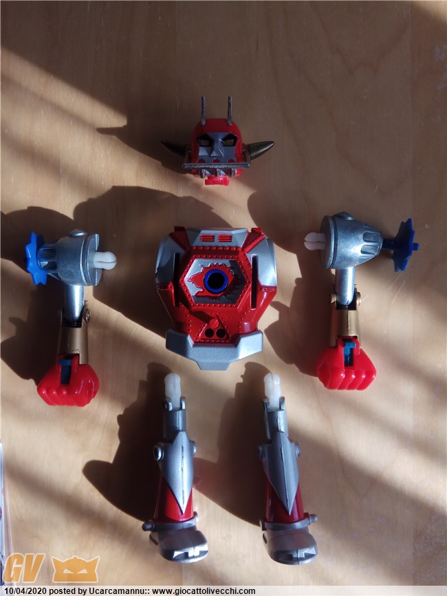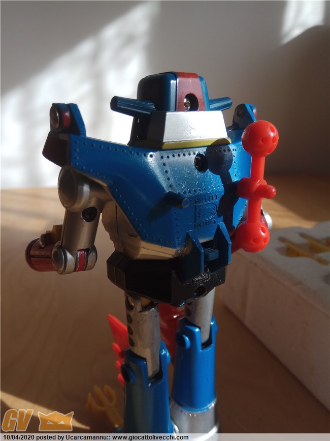 Purtroppo il pugno sx non resta in sede..... comunque Pugni sparanti, lame estraibili nelle gambe, tridenti estraibili dai piedi. Corazza apribile, nel petto vengono alloggiati i due famosi piruletti gialli ed un missile centrale sparabile.