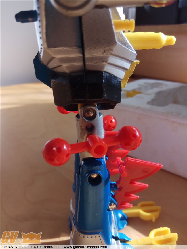 Possiede anche due strane "eliche" rosse che possono essere alloggiate sul missile centrale e a lato delle caviglie. Ha anche due piruletti rossi, ed uno di questi va inserito nel ventre, sarebbe una delle luci di controllo delle componenti.