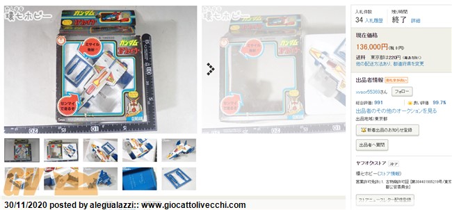 ...io mi aspettavo di più anche. A parte il problema della scatola che era mezza rovinata ma riparabile, vertina integra, missili sui telai giocattolo perfetto con lieve ossidazione della chiavina....l`ultimo che avevo visto in queste condizioni è do oltre 2 anni fa ed aveva fatto 175000 yen ed era in condizioni leggermente migliori. Stiamo parlando di pezzi che in scatola sono quasi chimere e insieme a questo uguale ed anzi anche peggio la base bianca. Sono anche goffi e bruttissimi, magari, ma se uno colleziona Gundam non fa solo i Clover ma fa anche gli Orion e se uno fa gli Orion non può non sbavare dietro a questi pezzi