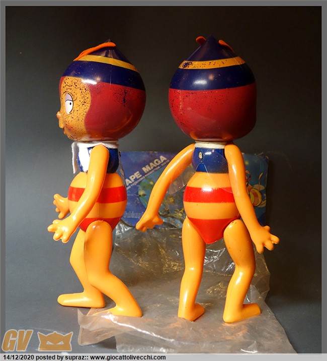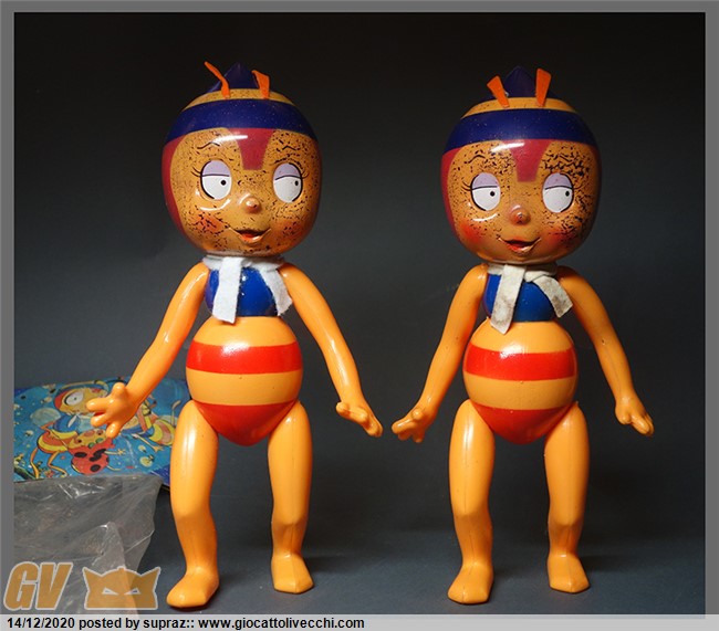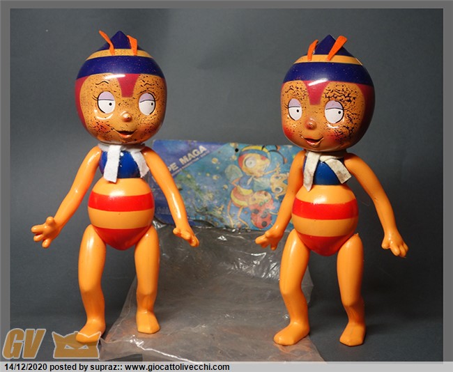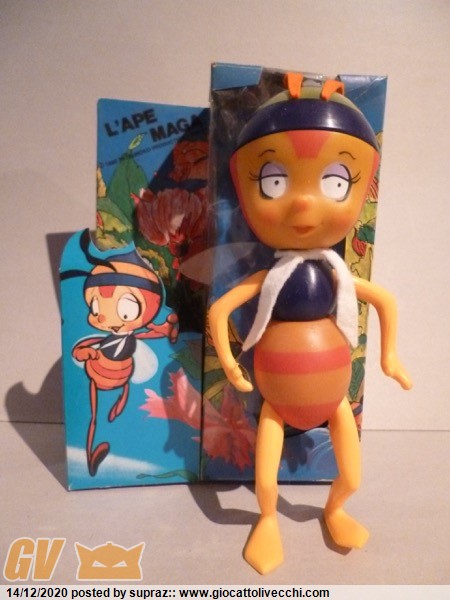 ho deciso di fare questa breve recensione dopo aver trovato una seconda ape. Premetto che è stata pura fortuna averne trovata una seconda, visto la rarità del pezzo..... e pensare che fino a qualche mese fa ero ignaro del esistenza di questo vinile, al contrario conoscevo tutte le altre api prodotte in italia. l ape è alta al incirca 30 cm, è interamente di plastica rigida, vuota al interno. le antenne e il foulard sono in panno lenci.....aggiungo che una di queste api aveva gravi danni al foulard che ho ricreato seguendo il modello originale, una seplice striscia bianca lunga 18 cm l originale era totalmente tarmata.... queste api venivano vendute in una semplice busta di plastica con la classica etichetta in cartone. la busta e lunga 32cm in altezza per una larghezza di 19... sul cartoncino viene riprodotta la classica grafica presente anche sulla scatola piu piccola della fabianplastica, quella dell ape piccola, per capirci. il vinile è articolato braccia e gambe e testa si possono muovere. il corpo è fatto di una plastica color gialla....mentre le righe rosse sono di una vernice molto resistente come il busto color blu. mentre la testa è realizzata con una plastica blu scura che si intravede sulla parte superiore della testa..... ho notato che la vernice applicata sul viso e in particolar modo la parte gialla è molto delicata e con il tempo e il tipo di conservazione tende a perdere piccoli pezzetti.....ovviamente ora il processo di deterioramento è fermo visto che l ape non è piu in contatto con la busta.....le due bambole provengono da diversi luoghi e regioni....quindi sono ancora piu` sicuro della mia teoria....difficilmente si potra` trovare di meglio come stato di conservazione. in definitiva questo pezzo e unico nel suo genere .....la sua lignea, il suo design sono fenomenali rispetto le sue cugine piu` piccole.......la forma del viso ricorda molto il vinile giapponese....ma la colorazione è molto piu` fedele.....sono felice di postarvi qualche foto.
