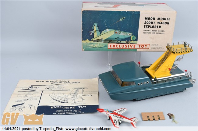 Finalmente, grazie ad un utente del forum, ho trovato informazioni su cosa sia una sorta di astronave che ho recuperato in modo clamoroso dalla mia infanzia, e che vorrei ripristinare. Nell specifico si tratta della MOON MOBILE SCOUT WAGON EXPLORER della Bandai Japan ed in esclusiva per i magazzini Sears. A parte alcune sistemazioni alla carrozzeria, che potrei fare io senza problemi, vedo che mi mancano: 1) cingoli in gomma; 2) un paio di omini verdi. Ho un cingolo originale, ma rotto e non riparabile, perchè tendente a disintegrarsi e potrei usarlo per dare la base di copia a chiunque li possa ricreare ed anche uno degli omini in plastica, potrei estrarlo per farne le due copie mancanti. Chiedo un aiuto per sapere se conosceste qualcuno che possa ricreare i cingoli ed anche gli omini. Allego qualche foto: Grazie mille.
