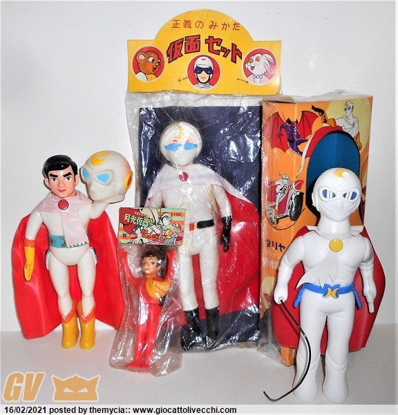 da sx a dx -old bandai con maschera removibile...anime version -lo scorpione rosso in busta popy..uno dei villains... -versione tokusatsu tarocco masudaya(come si può notare invece della maschera intera tipica dell`anime ha il turbante e la sciarpa con un paio di occhiali da sole...la luna è posizionata al contrario...) -bottiglia shampoo in box ..questa è davvero spettacolare....con mantello, cintura, frusta e pistola!credo sia il più complesso shampoo container mai prodotto...