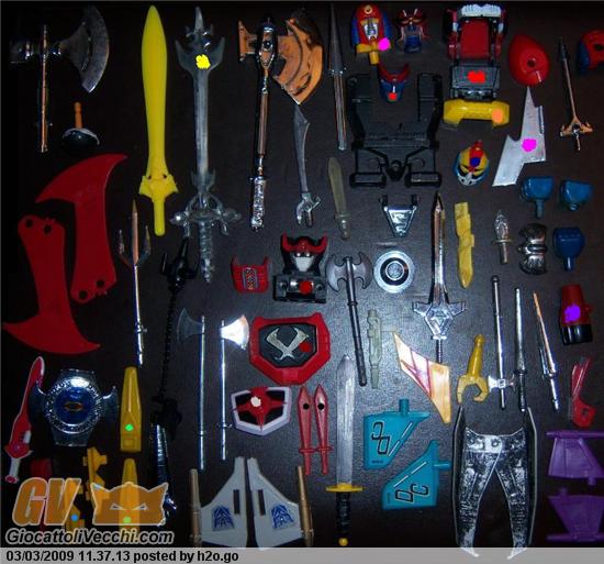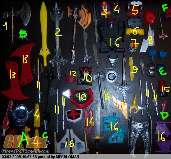 1 ascia Gordian dx 2 spada Golion medio 3 testa Daitarn Push 4 parti Antares (del Daltanius dx) 5 testa Golion dx (leone nero) 6 accessorio Daimos 7 testa Spinlacer Ginguiser 8 lama piede Daitarn Push 9 accessorio Daimos 10 parti Goshogun medio 11 accessori Battle Fever 12 Spallina X-Bomber (forse il medio) 13 pezzi Mazinga Z SOC 14 spade Mazinga Trans Jet (tarocco) 15 lancia missili cavallo del King Atlas (Micronauti) 16 accessori Transformers