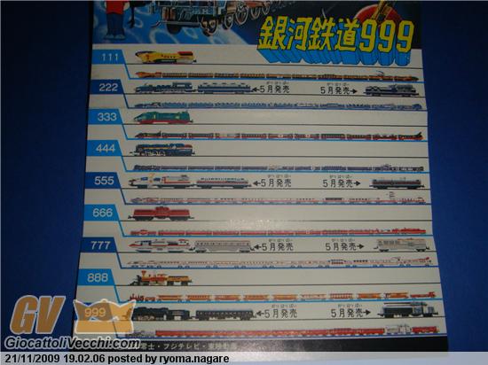 In effetti...8 in tutto. Se davvero sono stati fatti i vagoni passeggeri e i vagoni armi del 222-555-777-999, in tutto sono 4 vagoni passeggeri e 4 vagoni armi. Dal cataloghino sembra proprio cos? tant`? vero che è titolato "No.222 No.555 No.777 No.999" e gli unici vagoni che si vedono aggiunti ai locomotori sono proprio questi, degli altri 5 treni c`è solo un disegno. Se a questo si aggiunge il fatto che a quanto sembra nessuno ha mai visto i vagoni aggiuntivi del 111-333-444-666-888...la oincidenza sembra davvero esagerata. Cmq speriamo dai che cos? la disperazione è limitata.
