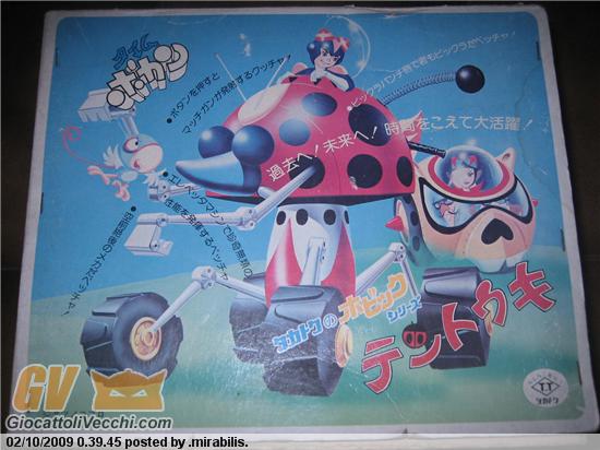La Takatoku, in un momento di euforia creativa databile fra il 1974 ed il 1976, lanci? sul mercato alcuni toys (4 in tutto che io sappia) sotto una linea chiamata Hobic. Parliamo di toys di scala abbastanza grande, non inseribili propriamente nel genere pla-dx e nemmeno nel jumbo, ricchi di meccanismi e realizzati principalmente in plastica. I toys esistenti sono 2 per la serie yattaman (il mechabuton hobic e il tentoki hobic) e due per la serie Ultraman Leo (una MACky ship e una MAC base). Il tentoki in particolare è davvero una delle meraviglie del giocattolo anni `70, ampiamente sottovalutato (forse perchè in fondo poco conosciuto) dai collezionisti: ha un antenna retrattile, dei pugni nascosti sui lati che si attivano alla pressione di un bottone, alcune chele (staccabili dal corpo), una specie di carrello elevatore che solleva la parte principale fino a circa 30cm, lanciamissili sul retro, un cockpit trasparente ricco di dettagli.