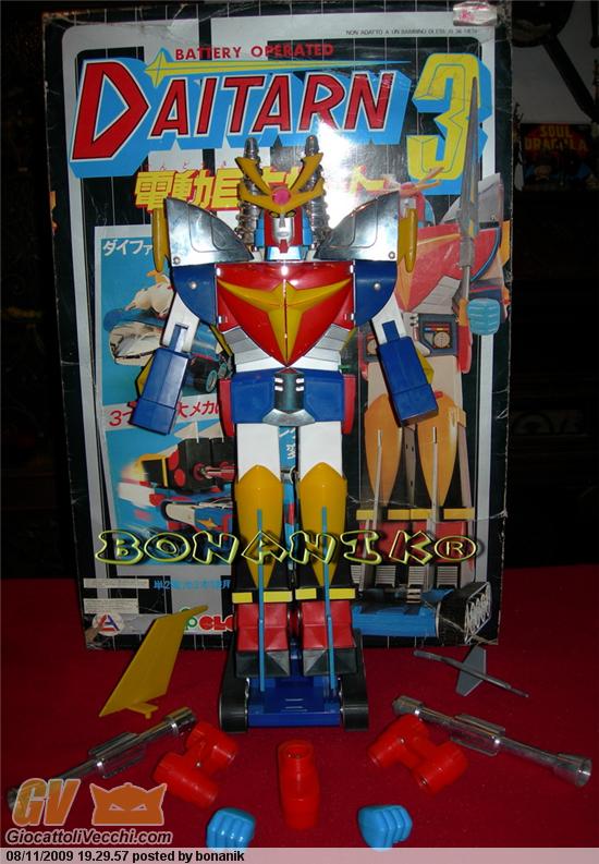 grazie bonanik! Forse e` meglio che mi spiego... gli oggetti sono miei ed il caro amico si e` offerto di fotografare e fare questo servizio alcune precisazioni: i pugni del daitarn mancano della parte terminale dell innesto e pertanto non restano inseriti a meno che non si tolgano le molle che li respingono o che si riesca a costruire la parte del pernino che si allarga.... lo starquest non solo e` completo ma non e` mai stato aperto in quanto fondo di magazzino ed e` ancora avvolto nella sua pellicola originale che anch`essa non presenta nessun difetto..praticamente un c11!!!