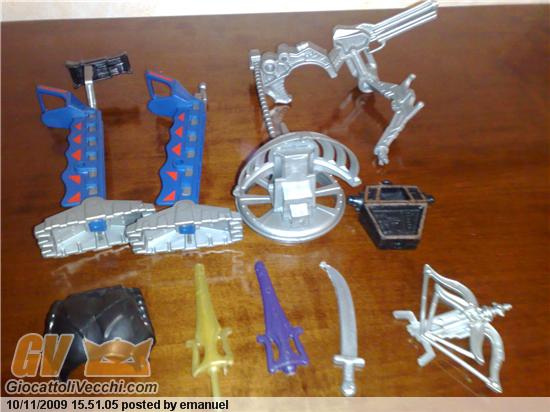 Io conosco quelle dei Masters: -l`arco e la spada credo siano di ninjor -ascia rossa Rotar -serpente viola Squuuuueeeezzzzzeeeeee -pipistrello Hordack -le 2 pistole bordeaux sono di Multibot -mitra viola di Mosquitor (se nn erro) -scudo e palle rotanti di He Man "palle rotanti" -arma alla sinistra dell`ascia rossa è la chiave Cosmica di Gwildor