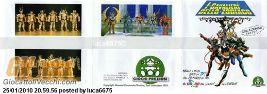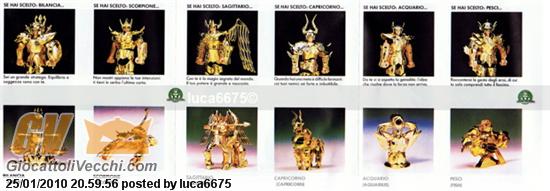 Secondo me le confezioni italiane fanno schifo rispetto a quelle francesi o spagnole (per non parlare delle jap) ed eccone i motivi: 1) le scatole blu (non a tempio) hanno un problema di dimensione rispetto al polistirolo che è all`interno, infatti a parte Gemelli, Bilancia e Pesci il polistirolo è più piccolo rispetto alle scatole; 2) i disegni sulle scatole fanno ridere. Chi li ha fatti? Un bambino dell`asilo? 3) le scatole giapponesi, spagnole e francesi hanno nel retro una storyboard che ci racconta chi è il personaggio o rappresentano episodi dell`anime in cui si vede il personaggio stesso; mentre le italiane sono state rimpiazzate da marchi pubblicitari della serie "Collezionali tutti"; 4) sulle scatole ci sono spesso errori madornali, del tipo: a) Andromeda, il segno è in realtà Andromeda seconda armatura (o Andromeda la notte :( ); b) i cinque cavalieri di bronzo montati sui personaggi sono i prototipi della bandai jap e non quelli che realmente trovi nelle confezioni; c) nelle confezioni a tempio hanno inverito i nomi dei personaggi Cavallo del mare-Dragone del mare e Andromeda la notte- Acquila di bronzo; d) Acquila di bronzo? Declassata a livello di bronzo da cavaliere d`argento???? 5) trovo scorretto che il bollino della "giochi preziosi", che è di fatto la distributrice del prodotto in Italia, sia più grande e numeroso del marchio BANDAI. Ovviamente tutto ciò non si trova nelle confezioni spagnole o francesi, dove L`UNICA cosa che i distributori hanno fatto è stato tradurre i nomi dei personaggi.