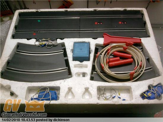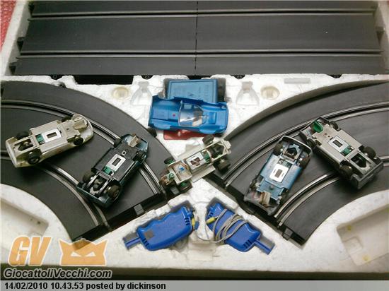 Ciao,se c`è qualche esperto di piste vorrei porre questo quesito:ho trovato questa pista,penso che sia rara ma potrei sbagliarmi.Ora,avendo già una 4 corsie "Storia della Ferrari" sono indeciso se tenere solamente i pezzi per ampliare la mia e vendere separatamente le auto.Oppure venderla per poi ricomperare le famose curve a 30° necessarie per poter fare le 4 corsie. Da notare che questa pista è composta da 2 scatole che unite formano il circuito a 4 corsie. Le auto che mi hanno dato sono le 2 originali più altre dell`epoca.I pezzi tipo piloni ecc.non si vedono tutti dalle foto in quanto molti sono sotto i pezzi della pista,e non avevo il tempo di estrarli.Grazie!