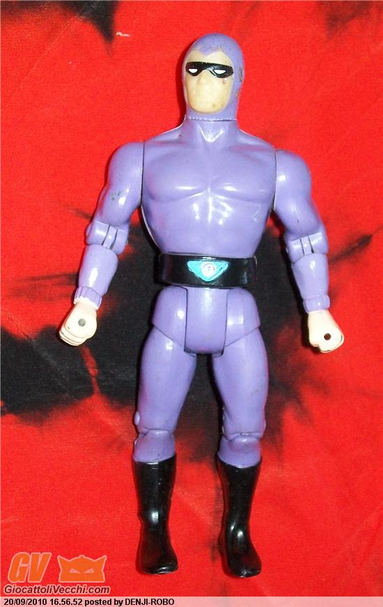 Ciao, questo è Phantom dei Defenders of the Earth della Galoob. Dovrebbe avere una pistolina nera ed una piccola frusta di corda nera. Purtroppo non ha un gran valore: è forse il più raro degli eroi buoni della serie, ma nuovo ci fai al massimo 15 euro. Peccato perchè ormai ce l`ho, l`ho cercato per un anno. E` un giochino ben fatto e molto solido comunque. Ciao!
