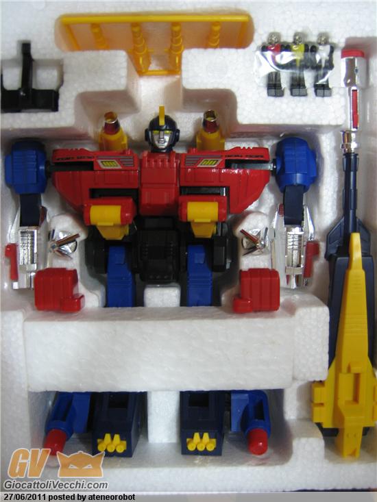come potete vedere, la confezione è provvista dei soliti dianauti, questa volta di seconda generazione e per la precisione: corpo rosso , corpo giallo e corpo bianco ( tutti gli arti sono neri ) un elmo da battaglia ( utilizzabile in entrambe le trasformazioni del robot ) un grosso cannone ( per la trasformazione in mezzo corazzato da battaglia, una sorta di tank ) 4 missili gialli e due trivelle argentate che possono sostituire le mani del robot.
