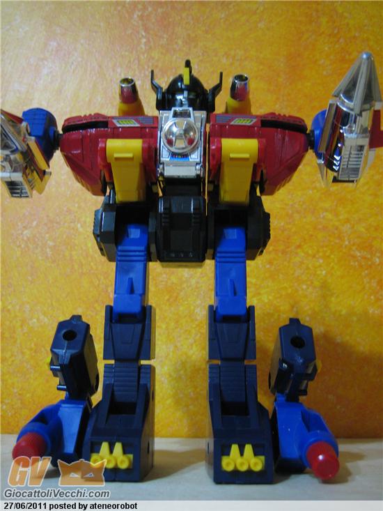 E` interessante questo modello, secondo me uno dei mecha più ben realizzati e ben studiati della linea fantascientifica Diaclone. il Mecha in questione tramite un sistema di scorrimento centrale e laterale che interessa soprattutto gambe e petto ( insieme a tutta la parte centrale del robot ) è in grado di trasformarsi in due efficaci robot da combattimento, più un terzo mezzo da battaglia dotato di un grande cannone.
