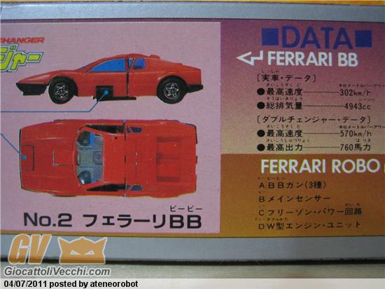 Famoso per essere "Overdrive" nella linea Transformers degli Omnibots ( che erano acquistabili per posta in USA coi punti della promozione "Reinforcements From Cybertron" ) la Ferrari BB si differenzia dalla linea delle "normali" autorobot per le dimensioni più ridotte ( in effetti è un peccato che non sia propriamente in "scala" con gli altri Autorobot, ma un pò più piccolo..) e per la mancanza di Dianauti nella confezione .