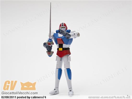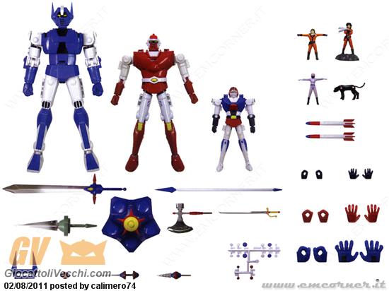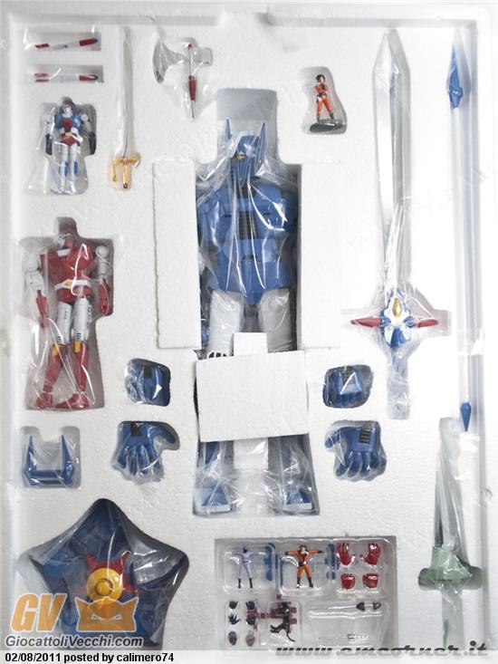 Dotazione ed Accessori generale: La dotazione di accessori è più che soddisfacente e si va da quelli enormi, tipo la spada o la lancia, fino alle minuterie vere e proprie, come le mani intercambiabili e le armi del robot più piccolo. Sono tutti di buona fattura, anche se in quest’aspetto il richiamo al vintage è forse un po’ troppo marcato. I figurini sono accettabilmente dettagliati in rapporto alle dimensioni effettive.
