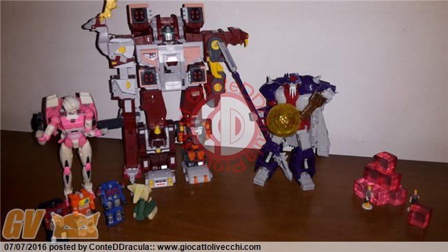 Similmente ho fatto approdare nella fazione dei buoni: una fembot (Arcee, versione delicate warrior, cioe`la migliore in assoluto come fattezze, qualita`, colori, proporzioni tra quelle fatte 3rd-party... e confrontandola anche con una recente originale della takaratomy-hasbro), ben 4 headmasters (3 inventati di sana pianta come i precedenti ed uno, Cobra/Toxin, invece mai prodotto se non in modo unofficial), un combiner bellissimo, il Glacialords, ispirato ai vari Menasor/Computron/Piranacon/Superion eccetera (e dagli arti intercambiabili tra loro, ma anche con i suddetti originali!)... infine un altro dei papa`-caposaldo dei transformers: Alpha Trion corredato della chiave-circuito Vettore Sigma. Chi ha visto almeno le prime 3 season capira`di cosa stia parlando per la maggiore in questi post. Gli operai che vedete vicino quei cubi di energon hanno le dimensioni dei driver diaclone, sono Spike e genitore, come spesso si vedevano nel cartone animato. Ed infatti sono si possono tranquillamente sedere nelle varie autorobot.