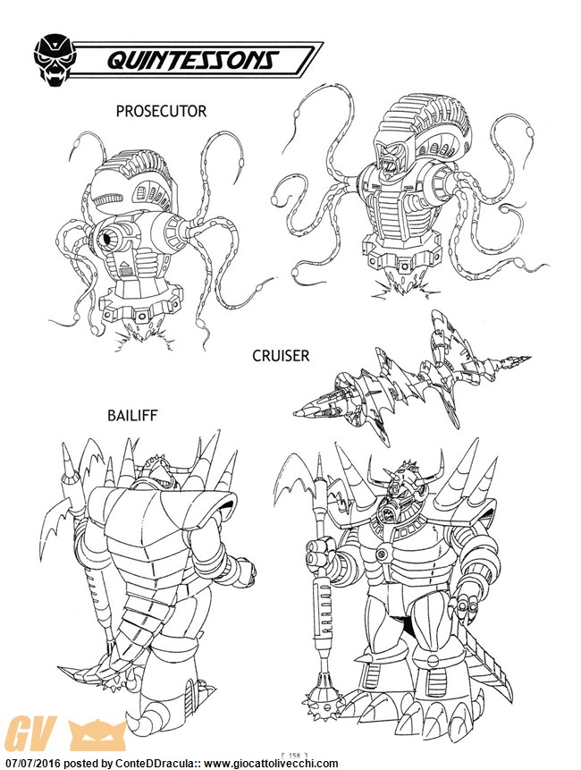 Sono gli ormai rari (!) Quint-01 /02 /03 /04 /05, ripresi dai disegni originali Judge, Scientist, Prosecutor, Executioner e la guardia Bailiff... poi visti in diverse puntate del cartoon: tutti sono cattivi, ovviamente, e fanno parte del "pantheon" dei Pre-transformers (non parlo di trasformer/microchange/diaclone... ma parlo proprio dei creatori degli automatismi senzienti che diventeranno col tempo Autobot e Decepticons). L` Allicon, trasformabile!, sempre della IT, molto bello... perfetto da affiancare alla creatura simile Gnaw (questa originale!).