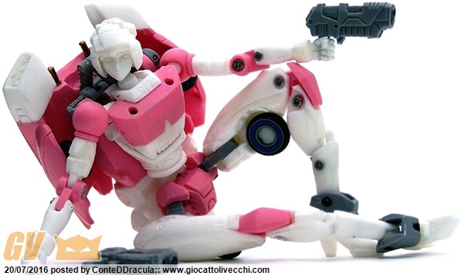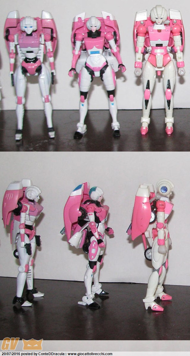 Di Arcee TRASFORMABILI con fattezze auto / G1 ne esistono 4 (se escludiamo una wst, world smallest transformers). Una inizialmente uscita come "garage kit" vecchissimo della rabid squirrel, l`A.R.C. molto bello per l`epoca (10 anni fa) durante la quale le 3rd party muovevano i primi passi solo con qualche accessorio scrauso/sostitutivo e qualche add-on... costosetta per l`epoca e costosa adesso. Era se non erro interamente in materiali plastici ed e`quella dalla quale devono aver preso parecchio spunto gli altri. Inoltre era ed e`ancora l`unica dove la testa era una sorta di headmaster / daniel (da Tf Rebirth).