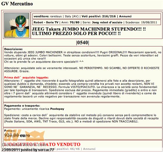 Il jeeg venduto qui a 5500 euro è lo stesso dell asta yahoo poco sopra finita a 3400 euro.