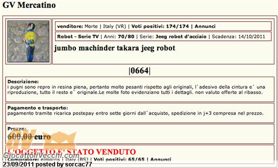 Asata del 14 Settembre 2011 Sito: GiocattoliVecchi Toy: Jeeg Loose Prezzo: Euro 600, 00