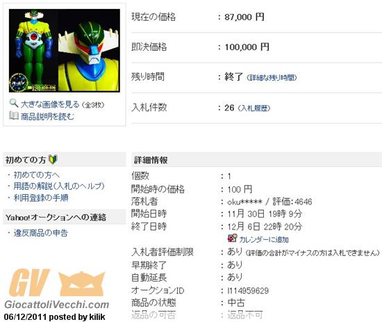 Asata del 27 Agosto 2011 Sito: Yahoo Japan Toy: Jeeg Loose Prezzo: 83000 yen = Euro 804, 00