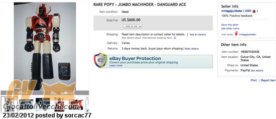 Asta del 26 Febbraio 2012 Sito: Yahoo Japan Link asta: http://page8.auctions.yahoo.co.jp/jp/auction/m93512108 Toy: Popy - Danguard Jumbo Machinder [Loose]
