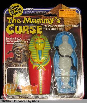 grazie del bellissimo complimento alessandrorocco!!! veramente un bel complimento!!! !!! !!! ti ringrazio tanto!! spero proprio che possa essere sempre spassoso e leggero come post!! a tal proposito, ecco un`altra pepita glow: la marca è la ARCO e l`anno è il 1983. il prodotto in questione è il fantomatico, quanto praticamente sconosciuto: THE MUMMY`S CURSE, cioè, semplicemente un sarcofago con la sua mummia rinsecchita e fosforescente al suo interno. lo scopo del gioco non è molto chiaro: c`è questo sacofago che quando viene aperto fa si che la mummia da stesa si sollevi verticalmente. ora, quale fosse il divertimento offerto da questo gioco, per me è un rebus come quelli ideati da Mike Bongiorno, ma forse all`epoca, se l`avessi visto in un negozio appeso dentro il suo blister, credo che l`avrei comprato. non so perchè, magari era simpatico da tenere in tasca per poi aprirlo al buio, non so, ma credo proprio che l`avrei comprato. ora invece che figuri o meno nella mia colezione è una cosa irrilevante, perchè in fondo è un gioco forse troppo semplice anche dal punto di vista estetico. ciò non toglie, che possa piacere molto! i miei commenti sono sempre personali e non mi pronuncio mai sull`effettiva bellezza di un pezzo. THE MUMMY`S CURSE quindi si va ad aggiungere a questa congrega di personaggi glow, aspirando ad un posto alto della classifica, forse ancora dominata, per quanto mi riguarda, dal caitano Kid e le sue ossa luminose. ed allora beviamoci un boccale di rum in suo onore, rilasciamo un rutto esplosivo come un barile di polvere da sparo, e viva la fosforescenza!!!! grazie ancora per i complimenti, alessandrorocco, sei un grande!!! ciao